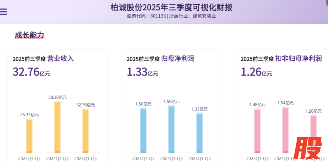 柏诚股份2025年三季报显示,前三季度公司营业收入32.76亿元,同比下降14.63%;归母净利润1.33亿元,同比下降16.22%;扣非净利润1.26亿元,同比下降17.91%。